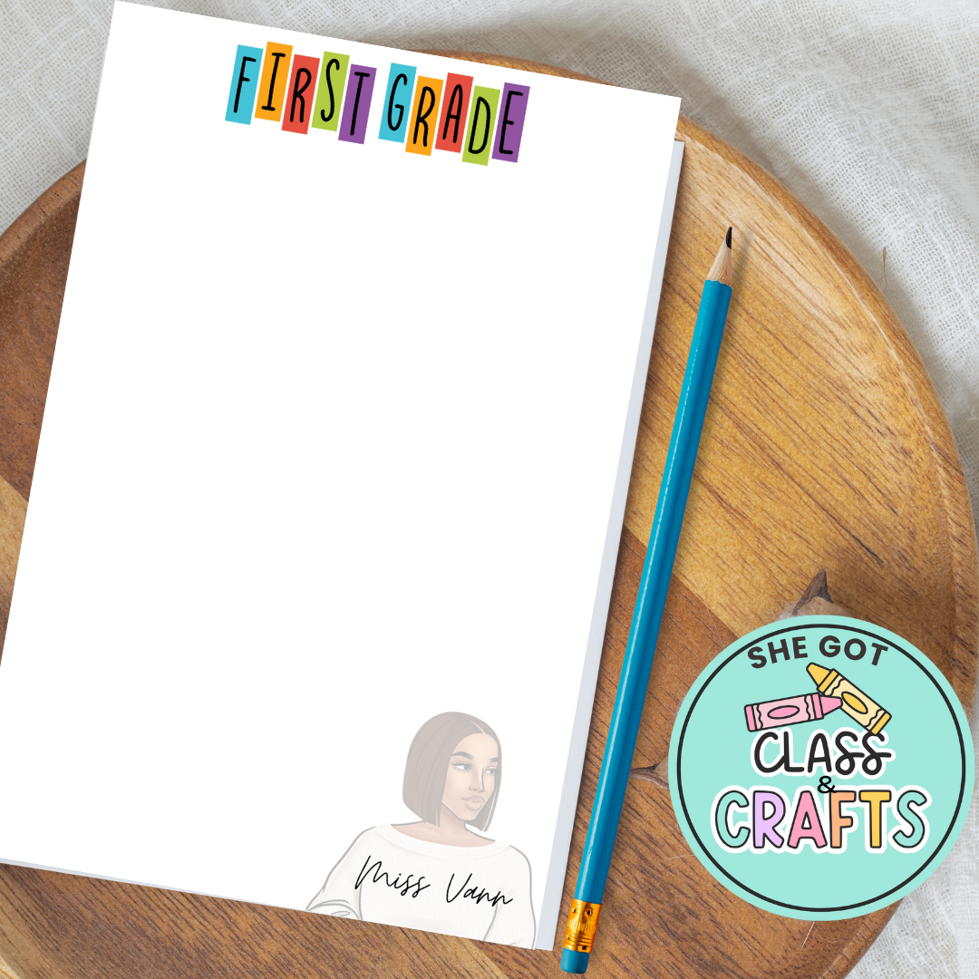 Bright, bold, and made just for the classroom! The 'First Grade Vibes Notepad' is perfect for teachers who love to personalize. With blocky, playful letters and a stylish character, this pad is a must-have for notes to parents, reminders, and more. Customize with your name and character. 4x6” | 50 sheets